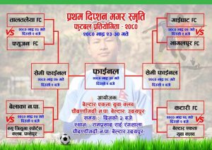 आगामी भदौ २३ गतेदेखी संचालन हुने प्रथम दिप्शन मगर स्मृती फुटवल प्रतियोगिताको टाईसिट सार्वजनिक भएको छ । आयोजक बेल्टार एकता युवा क्लवले आज सार्वजनिक गरेको टाईसिट अनुसार उद्घाटन खेल भदौ २३ गते सुन्सरीको तालतलैया फुटवल क्लब र उदयपुरको फ्युजन क्लब गाईघाट बोक्सेबीच हुनेछ । यस्तै दोश्रो खेल भदौ २४ गते गाईघाट फुटवल क्लब र भागलपुर फुटवल क्लबबीच हुनेछ । त्यस्तै तेश्रो खेल भदौ २५ गते बेलका नगरपालिका उदयपुरको टिम र न्यु त्रियुगा स्पोर्टस क्लब फत्तेपुर सप्तरी बिच हुनेछ भने चौथो खेल भदौ २६ गते कटारी पुटवल क्लब उदयपुर र आयोजक बेल्टार एकता युवा क्लबबीच हुने आयोजकले जानकारी दिएको छ । यस्तै पहलो सेमीफाईनल खेल भदौ २७ गते र दोश्रो सेमीफाईनल खेल भदौ २८ गते हुनेछ । फाईनल खेल भने भदौ ३० गते हुनेछ । सबै खेलहरु दिउँसो २ बजेबाट चौदण्डीगढी नगरपालिका वडा नम्बर ७ बेल्टार बजारस्थित शहिद रामप्रसाद राई रंगशालामा हुने आयोजकले जानकारी दिएको छ ।